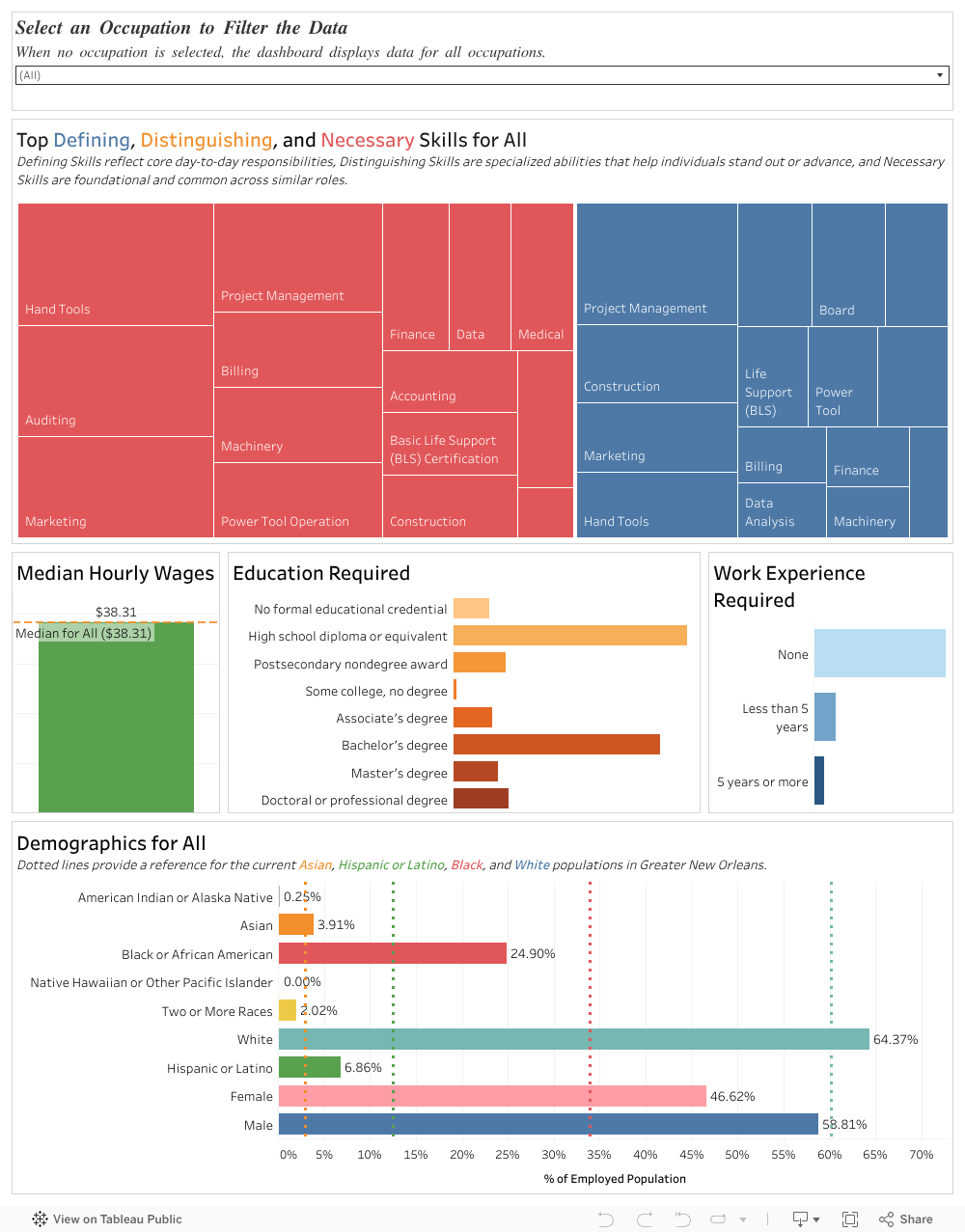 Use the dashboard to compare occupations, filter by key metrics, and identify where opportunity is growing. The analysis that follows highlights key insights, including the jobs with the largest employment base, the fastest-growing occupations, the skills employers demand, and how education, experience, and demographics influence access to these roles.