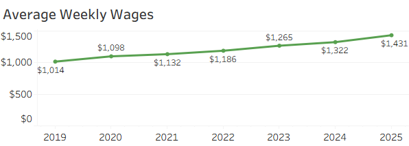 Average weekly wages in Greater New Orleans reached $1,430 in 2025, continuing a steady upward trend since 2019. Over six years, weekly wages have increased by more than $400 – a gain of roughly 41% – reflecting sustained income growth across the region.
