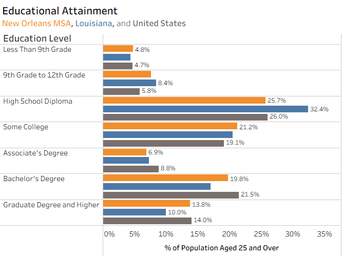 In 2025, 33.6% of adults in New Orleans hold at least a bachelor’s degree, outperforming Louisiana (27.0%) but still trailing the national average (35.5%). This reinforces the region’s position as a statewide leader in degree attainment, while highlighting a remaining gap with the U.S.
