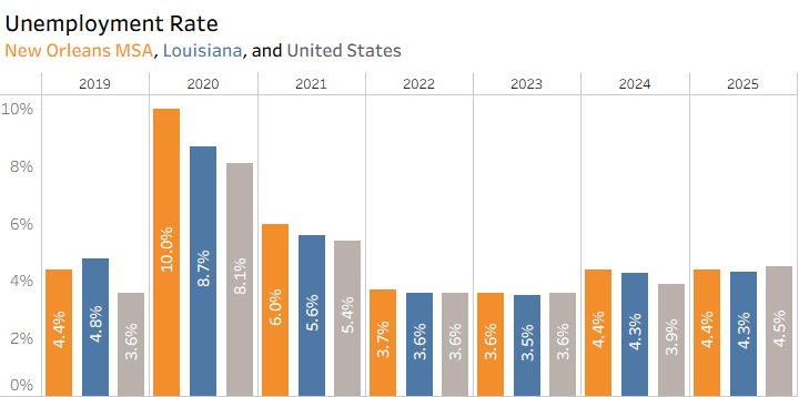 In 2025, the Greater New Orleans unemployment rate held steady at 4.4%, unchanged from 2024 and in line with its pre-pandemic level. This stability follows the sharp volatility of 2020 and the rapid recovery that brought unemployment down to 3.6% in 2023.
