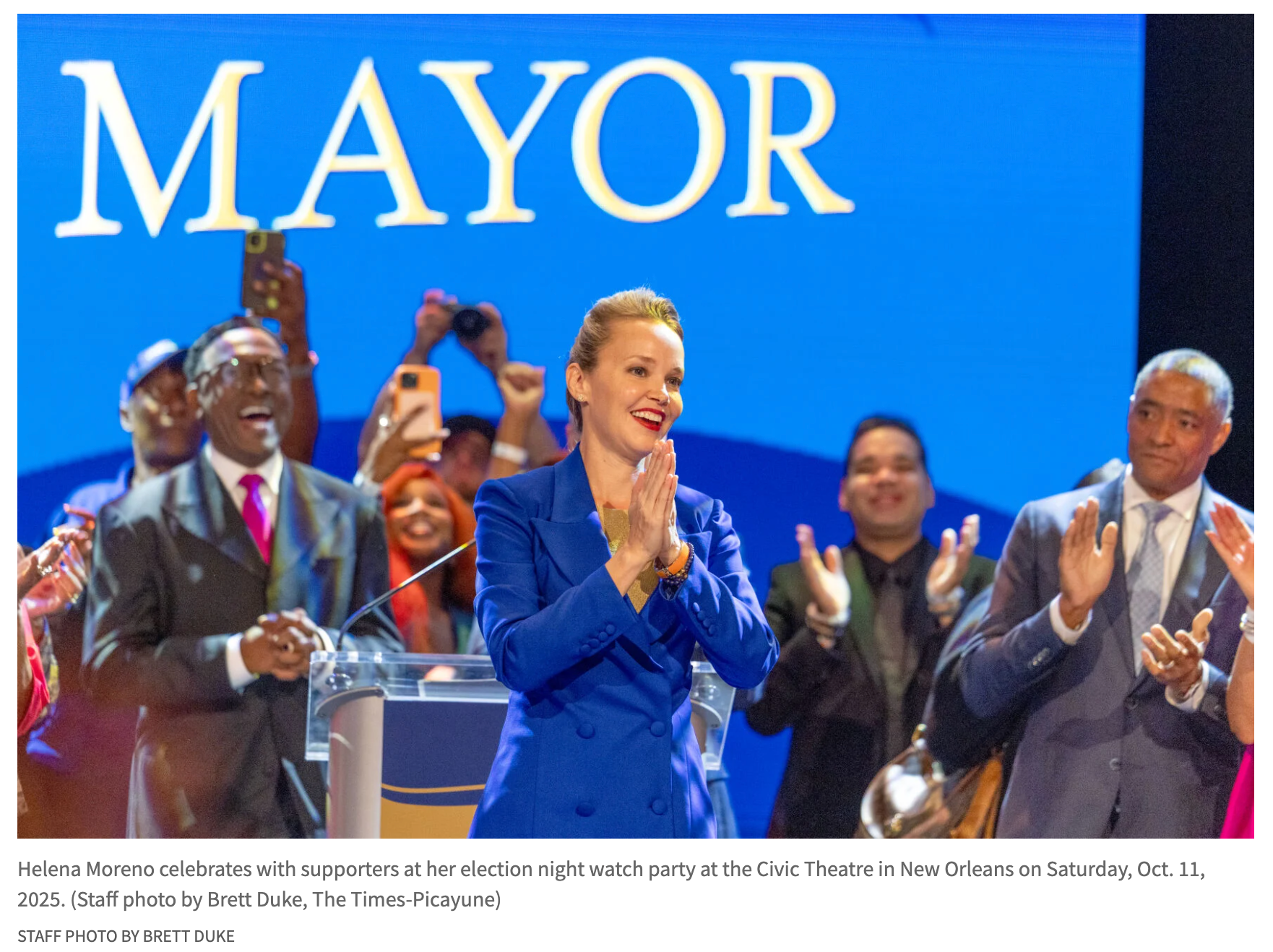 Helena Moreno will be New Orleans’ next mayor after securing an outright victory in yesterday’s municipal primary, capping a campaign that marshaled a diverse coalition and notched 55% of New Orleans’ citywide vote, avoiding the need for a run-off. Moreno, 48, becomes the second woman to win New Orleans’ top office and the first Hispanic person to earn that title.