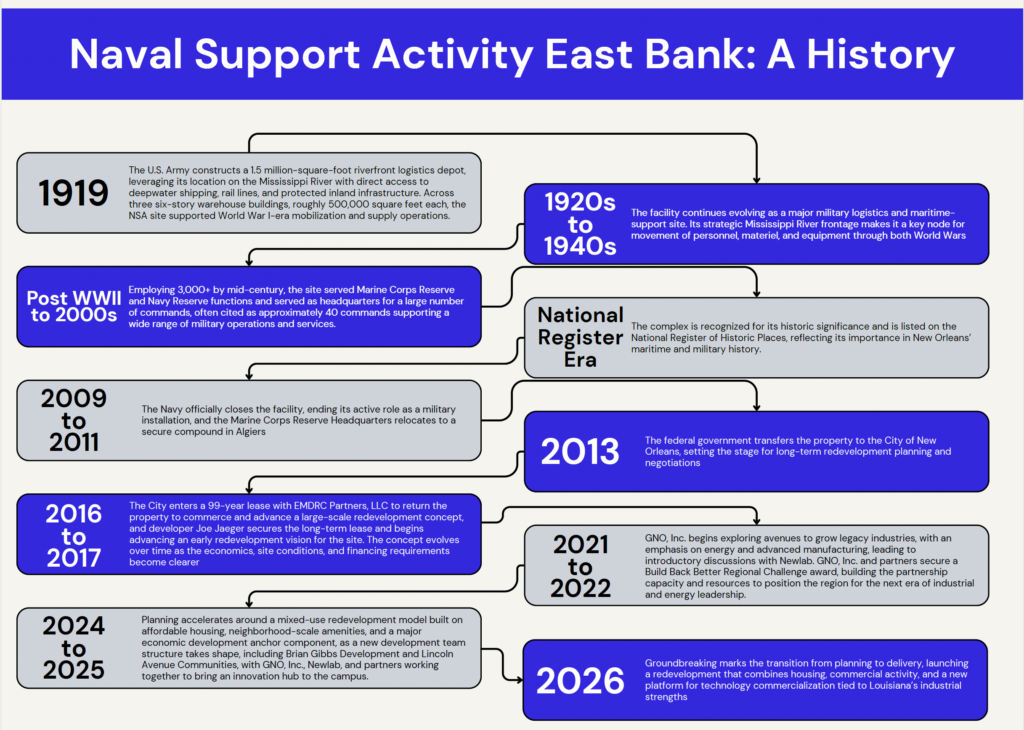 The first phase is anchored by the “NSA East Apartments,” a redevelopment by Lincoln Avenue Communities that will convert the former federal complex into a mixed-use site featuring nearly 300 affordable housing units and retail. In addition, the project will launch Newlab New Orleans, the nation’s top technology commercialization platform, which will provide a home for nascent companies in energy and maritime. Newlab has a track record of success in New York City and Detroit, as well as Montevideo and Riyadh.